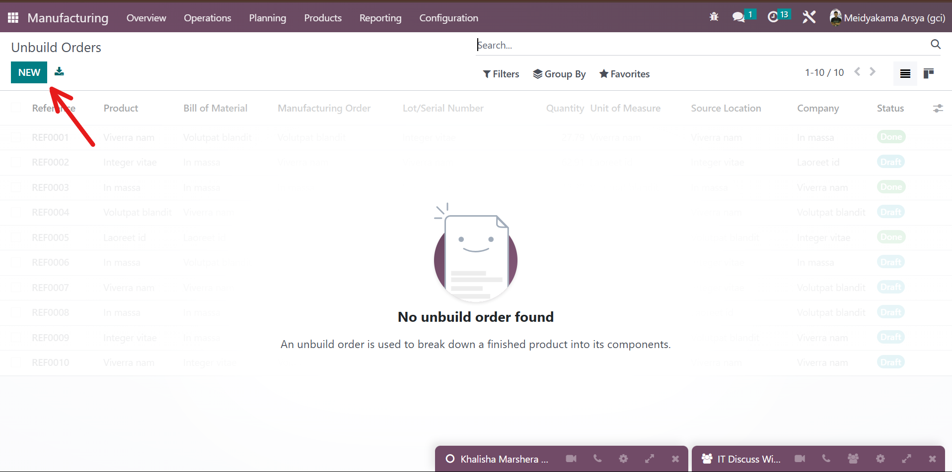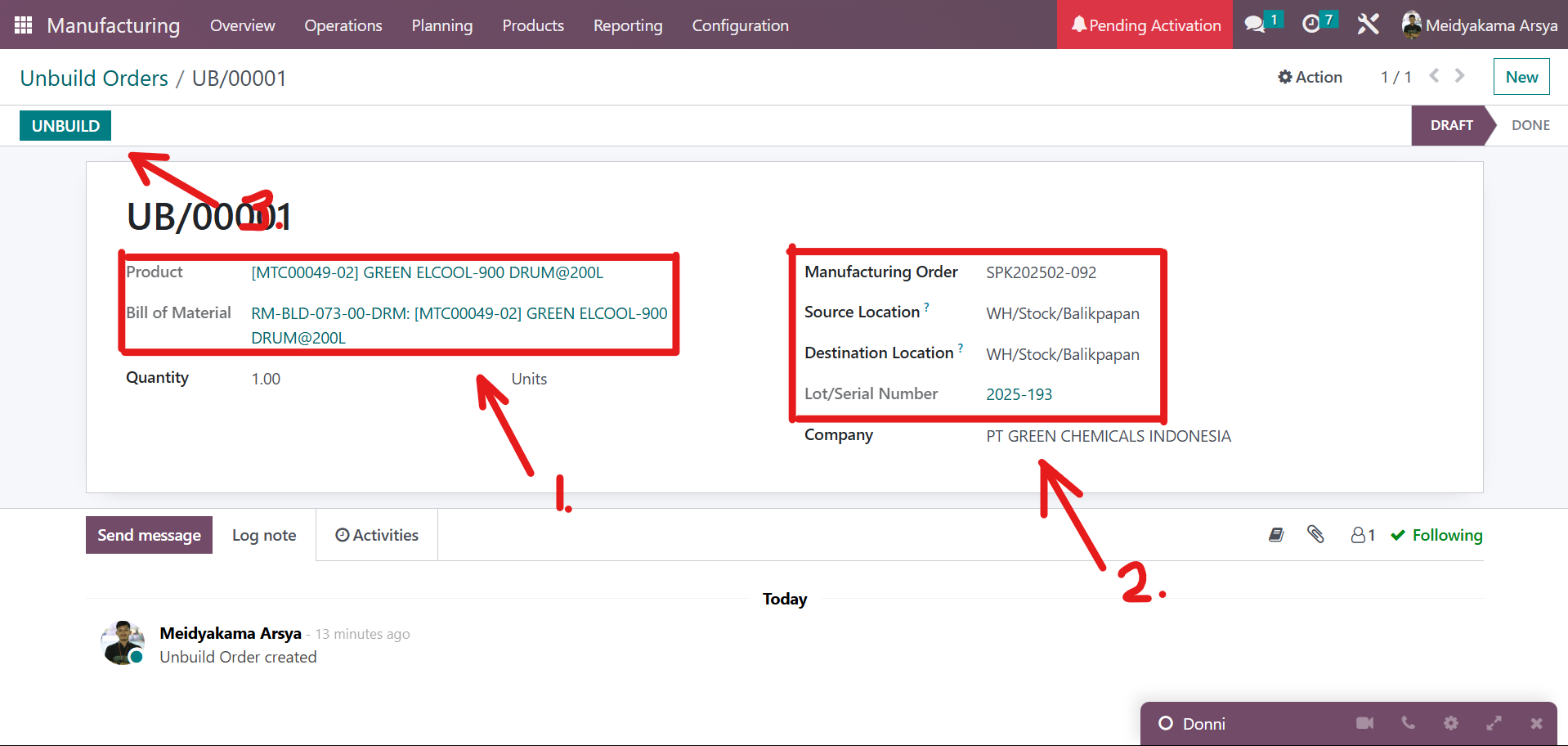 - Sesuaikan "Product", "Bill of Material", "Manufactoring Order", "Source Location", "Destination Location", dan "Let/Serial Number", setelah itu klik "UNBUILD" di sebelah kiri atas.